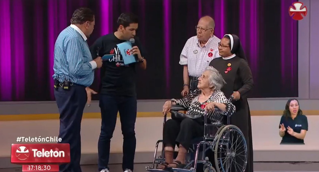 La presencia de dos residentes de Fundación Las Rosas en el escenario de la Teletón, entregando un aporte, no dejó indiferente a nadie. Ellos, que integran el segmento de las personas mayores más pobres y vulnerables del país, le demostraron al mundo que todos podemos ser solidarios. Frente a un emocionado Rafael Araneda y un conmovido Don Francisco, la hermana Ilya Chuchón, directora del hogar de Ñuñoa y dos residentes; Héctor de la Parra y Eliana Weitz, subieron al escenario del teatro para donar 292.000 mil pesos y cumplir su sueño de apoyar a la causa.