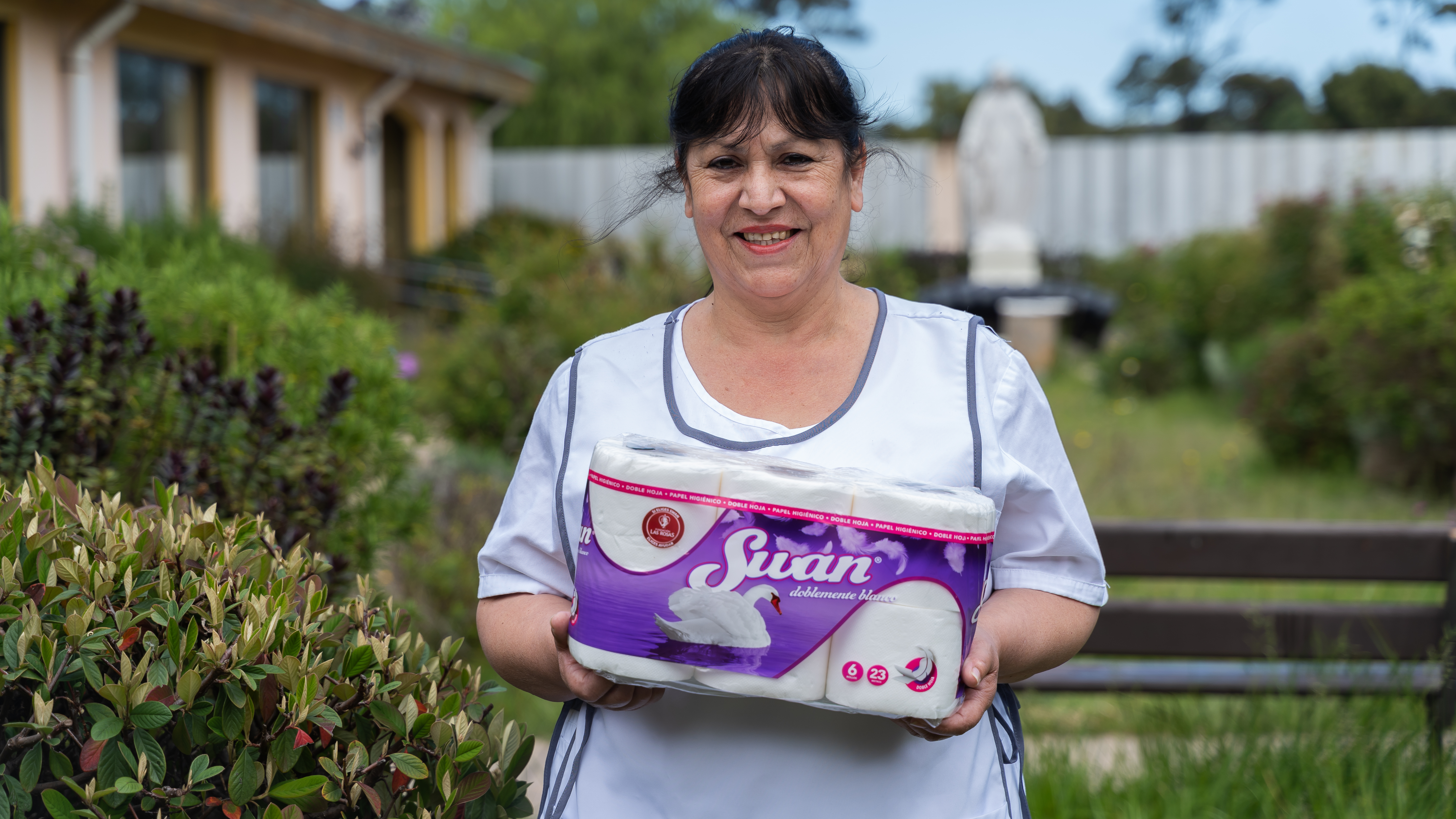 Swan es una marca de papel higiénico y toallas absorbentes de papel, que utiliza en su proceso de fabricación fundamentalmente celulosa, lo que contribuye a la suavidad y resistencia de sus productos. Una de sus plantas principales se encuentra en Coronel, cercana a los Hogares de Fundación Las Rosas en la Región del Biobio. “Nos gustaría regalar tranquilidad y alegría a quienes viven en el Hogar de la Fundación”, comenta uno de los operarios de la planta.