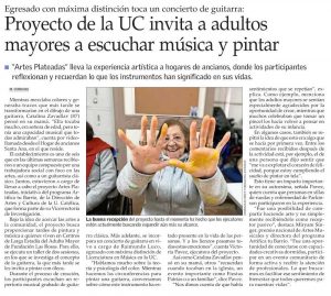 Éste es un proyecto creado y ejecutado por los estudiantes en vías de titulación de la UC, Raimundo Luco y Victoria Pavez, cuyo objetivo es llevar la experiencia de las artes a personas mayores que viven en hogares de la Fundación de la Región Metropolitana. “Artes Plateadas” es una iniciativa estudiantil que se inserta en el programa “Artifica Tu Barrio” de la Dirección de Artes y Cultura UC, que financia proyectos de integrantes de la comunidad universitaria.