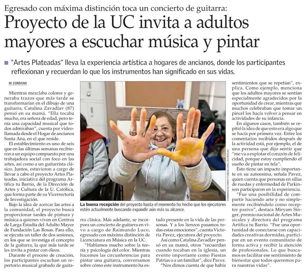 Proporcionar experiencias en torno a las artes es el objetivo de esta iniciativa, liderada por estudiantes UC y la Dirección de Artes y Cultura. Alrededor de 500 personas, en 8 Hogares de Fundación Las Rosas, participaron del proyecto «Artes Plateadas».