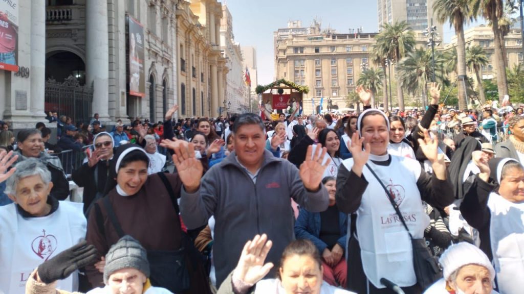 En la ocasión, nuestra comunidad conformada por Congregaciones Religiosas, Directoras de Hogares, Damas de Blanco, voluntarios, colaboradores y sus familias, junto a los hijos predilectos de nuestra Madre, los adultos mayores, caminaron entusiastas por las calles del centro de Santiago, guiados por el Capellán Nacional de Fundación Las Rosas, Pbro. Carlos Irarrázaval, al encuentro con nuestra Madre y Patrona.