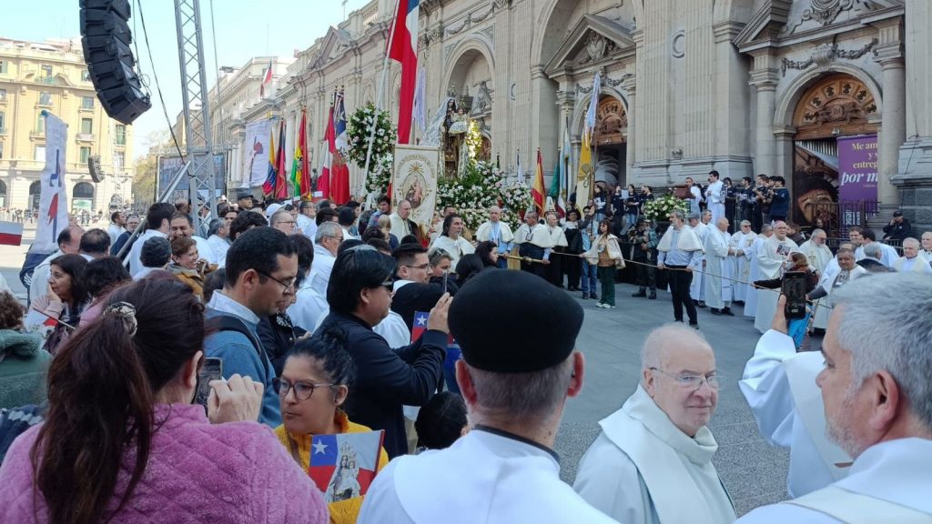 Este domingo 24 de septiembre frente a la Catedral Metropolitana, se celebró el día de Oración por Chile con la tradicional procesión de la Virgen del Carmen, que recorrió el centro de la ciudad de Santiago bajo el lema “Virgen María, une a tus hijos y renueva nuestra fe”.
