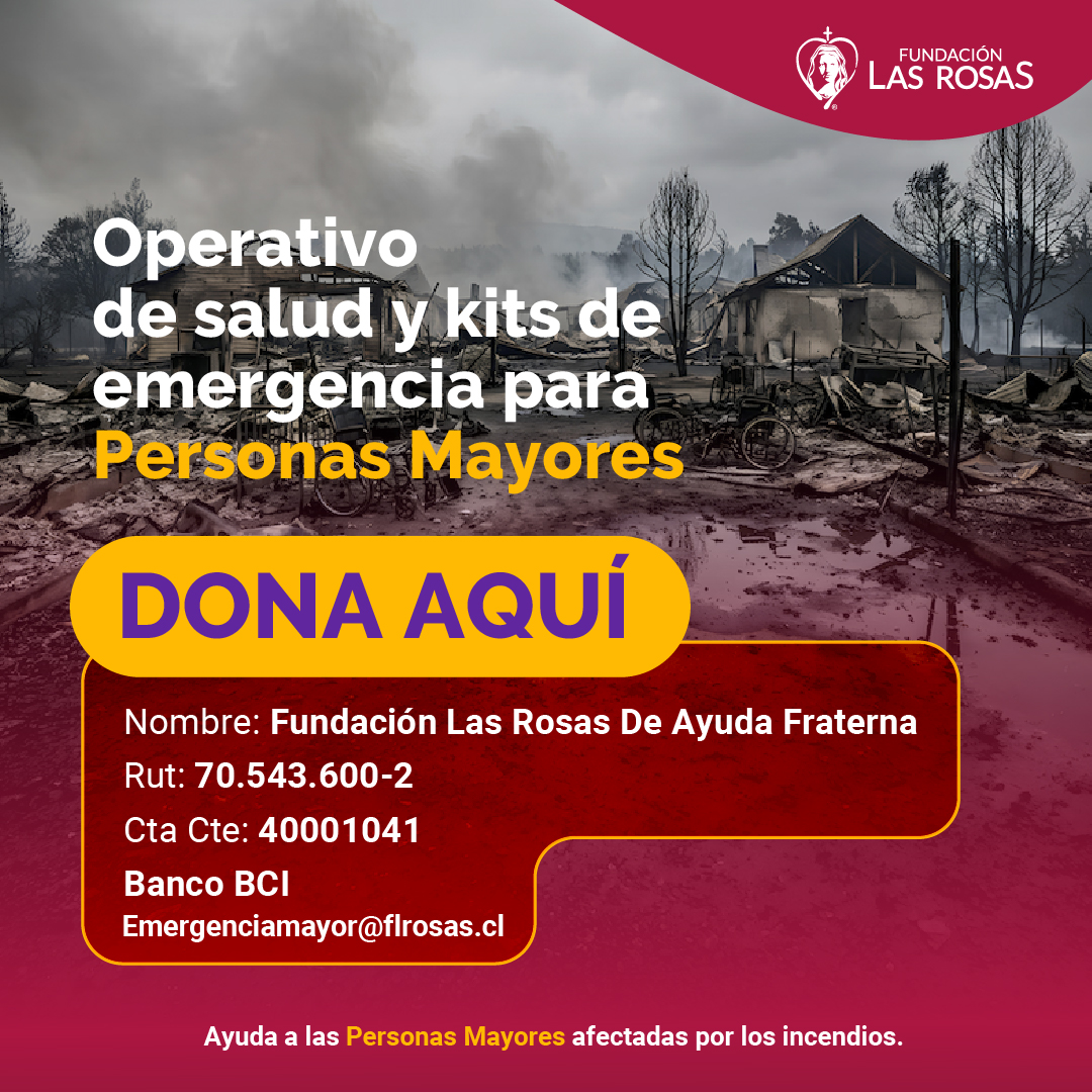 Conscientes de la dramática situación que enfrenta el sur del país y basado en su vocación de servicio a las personas mayores, los profesionales de Fundación Las Rosas están organizando un operativo de salud y entrega de kits de emergencia para asistir a las personas mayores que hoy se encuentran en albergues de las regiones afectadas por los incendios en el sur de nuestro país.